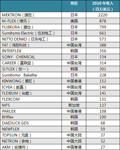 2010年全球柔性线路板排行榜